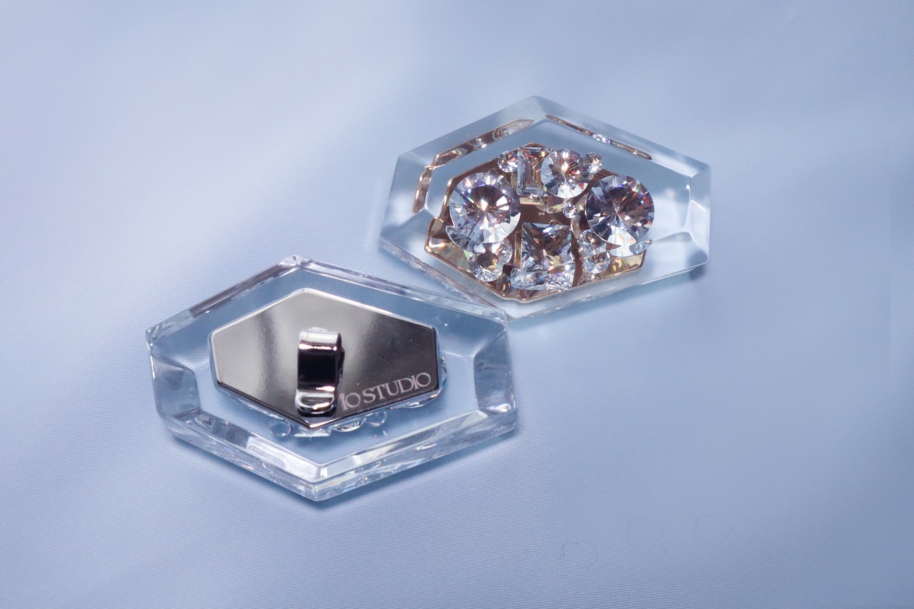ラウンドカット、スクエアカット、バケットカットの大きさや形が異なるストーンを、視覚的な楽しさと不思議さ、透明感と光の反射が美しく引き立つように配置しました。