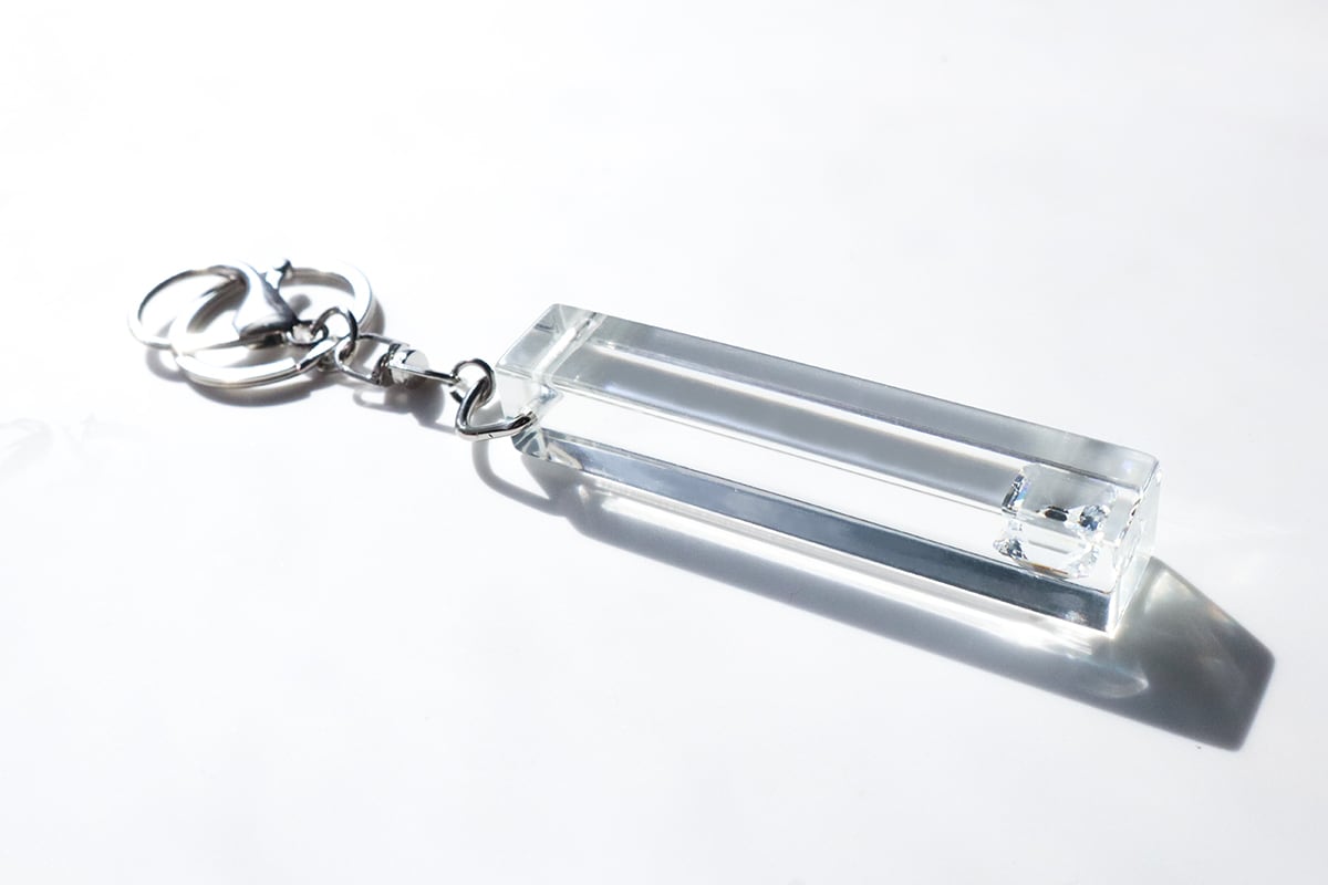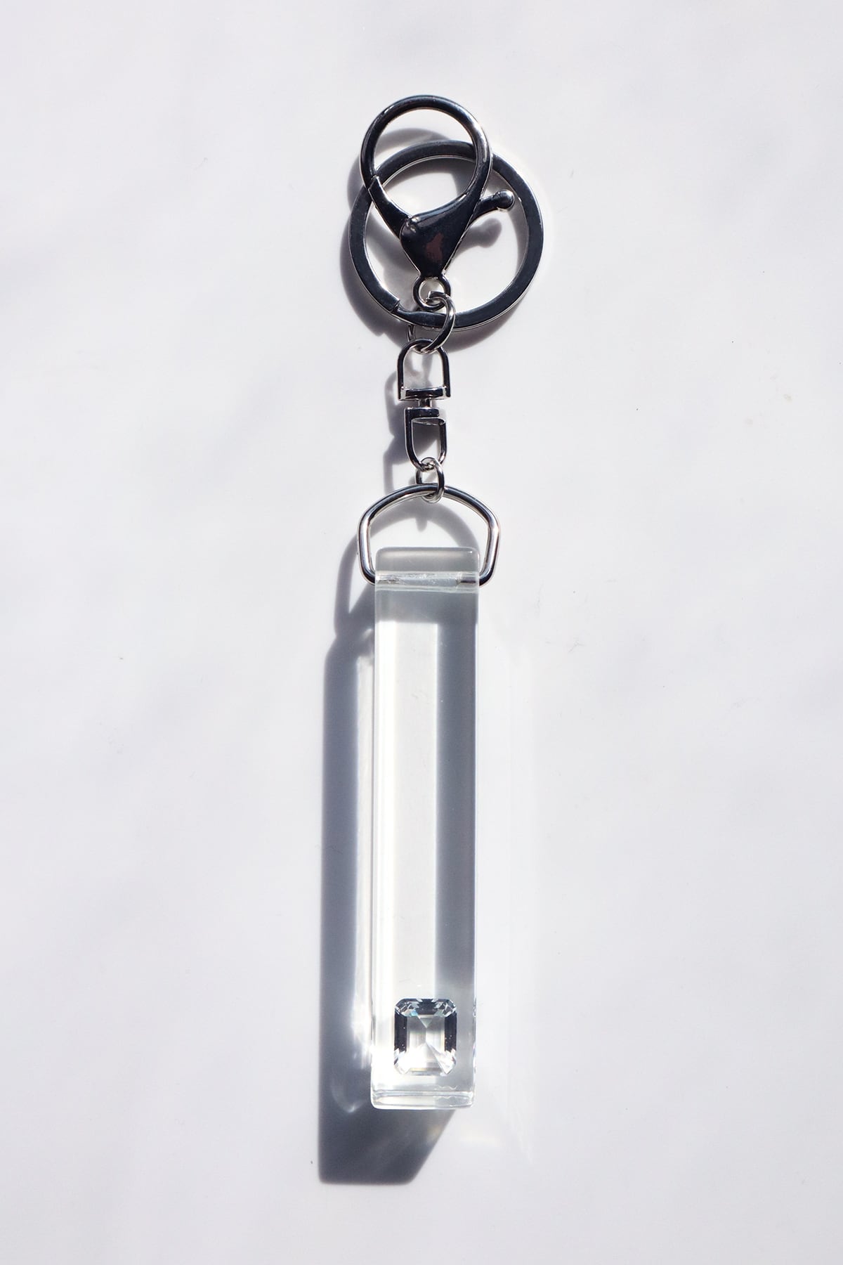 透明素材に大粒のエメラルドカットストーンを潔く1粒埋め込んだ、光の反射具合や透明感が見るたびにワクワクする今までにないキーホルダーです。