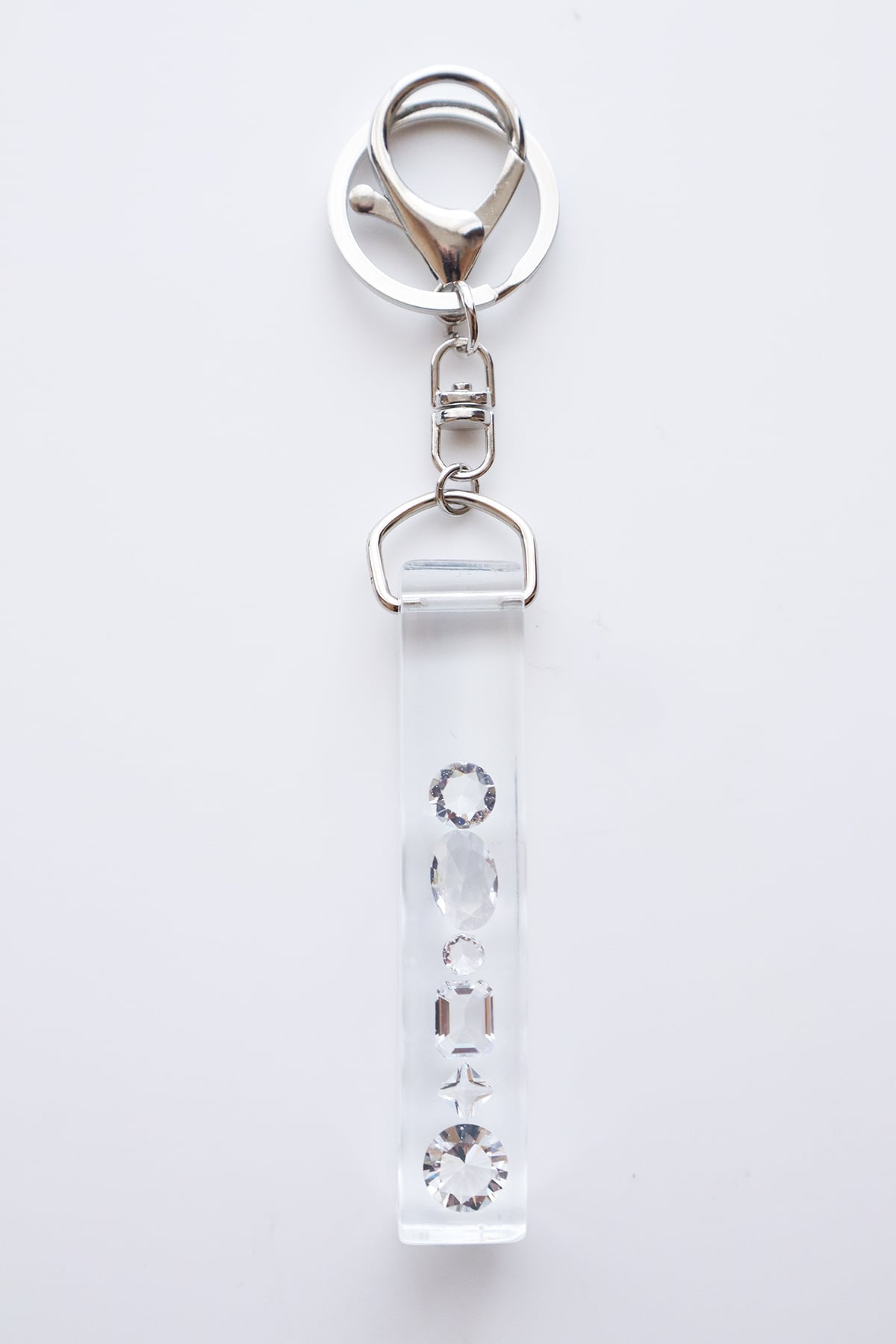 透明素材に色々なタイプのクリアストーンを埋め込んだ、光の反射具合や透明感が見るたびにワクワクする今までにないキーホルダーです。